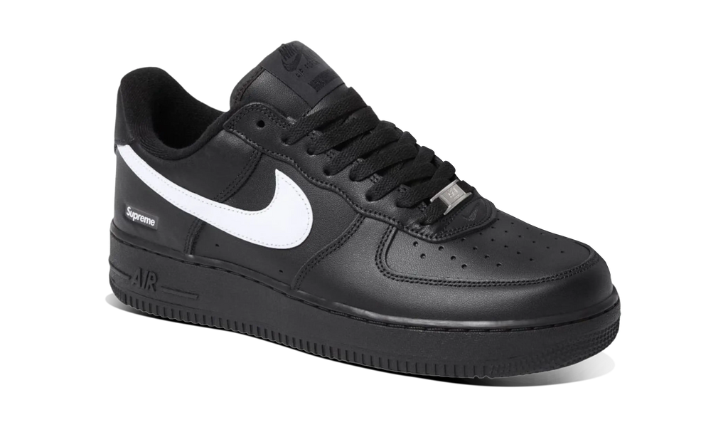 Las Nike Air Force 1 Low Supreme Black White representan la unión perfecta entre dos gigantes del streetwear: Nike y Supreme. Este modelo mantiene la silueta legendaria de las Air Force 1, fabricada en cuero premium, e incorpora el distintivo box logo de Supreme en el talón, símbolo de exclusividad y cultura urbana.